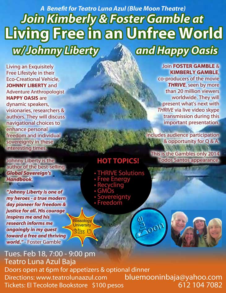 Presentation by Kimberly & Foster Gamble via Skype, hosted by Happy Oasis and Johnny Liberty. Doors open at 6:00pm, presentation starts at 7pm. Tickets: 100 pesos